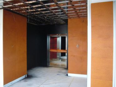 Zuilen,balie en plafond van MDF in kleur gespoten.