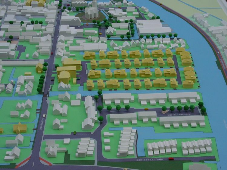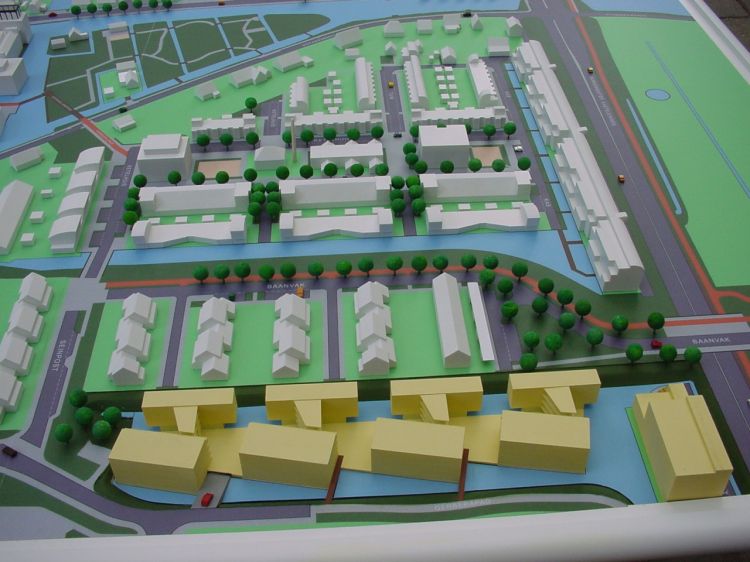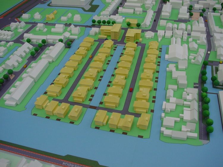 Nieuwe bebouwing in geel gespoten kunststof.